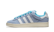 La Adidas Campus 00s Ambient Sky présente une base en cuir gris, accompagnée de trois épaisses bandes blanches sur le panneau latéral, caractéristiques de la marque et accordées au heel tab. Proche de la Campus 80s, ce modèle dévoile également une doublure bleue et une semelle jaunie, pour accentuer l'effet vintage.