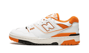 La New Balance 550 Syracuse affiche une empeigne mixte en cuir lisse et perforé blanc ornée d'empiècements oranges au niveau des brandings, du col et du renfort arrière faisant référence à l'équipe basket-ball de Syracuse. Le tout repose sur une semelle blanche aux accents noirs et orangés qui apportent du contraste à la silhouette vintage.