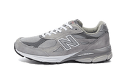 La New Balance 990 V3 Grey (2019/2021) présente une base en mesh gris, surmontée d'empiècements en cuir dans différentes nuances de gris pour un rendu quasiment monochrome. La confortable semelle ENCAP conclut le tout dans sa teinte bicolore grise et blanche.